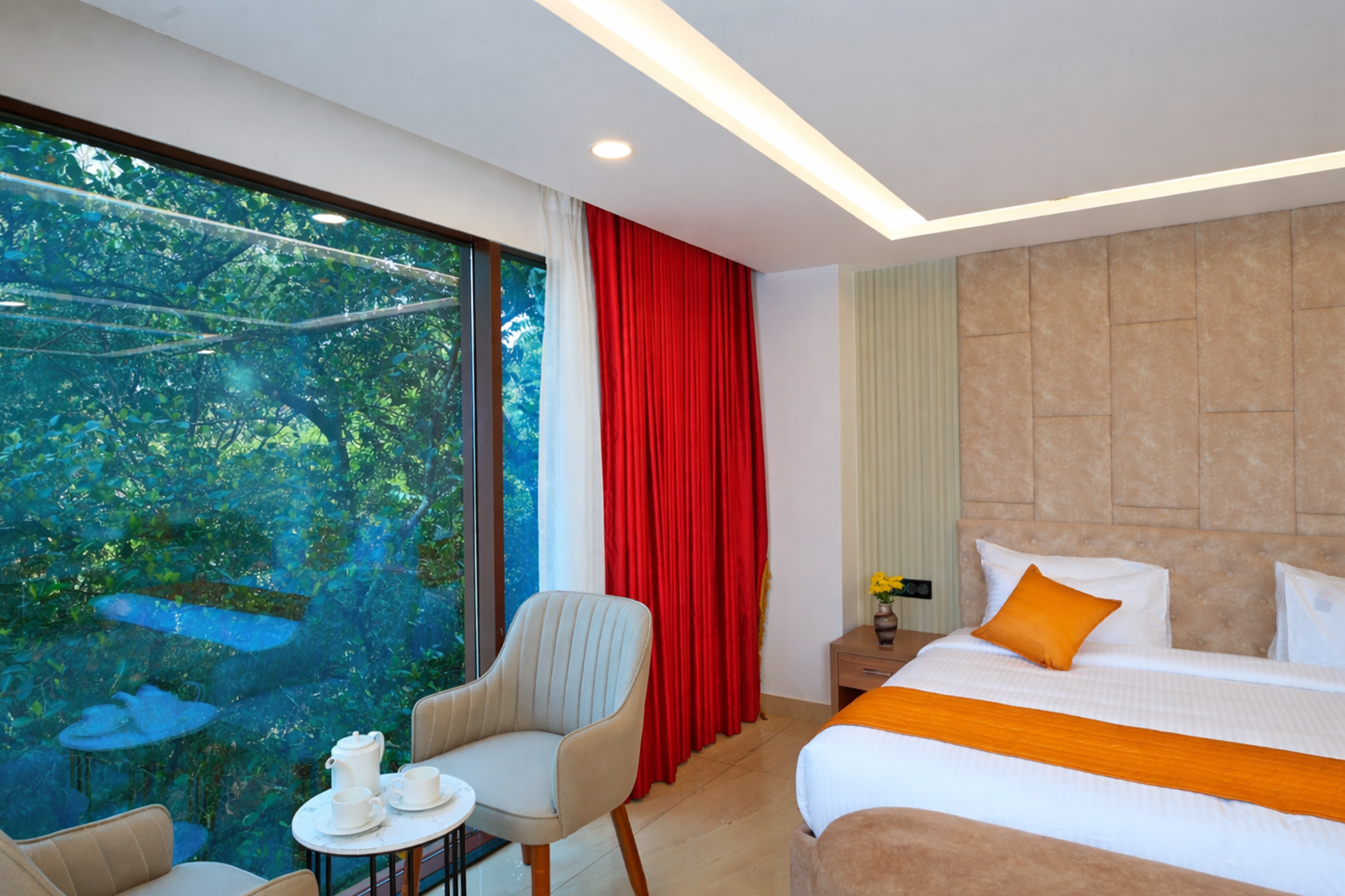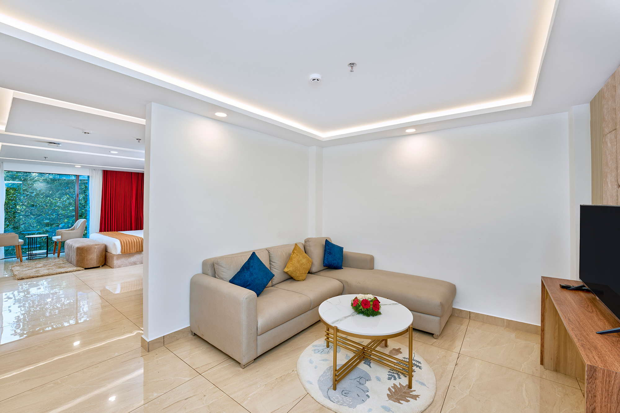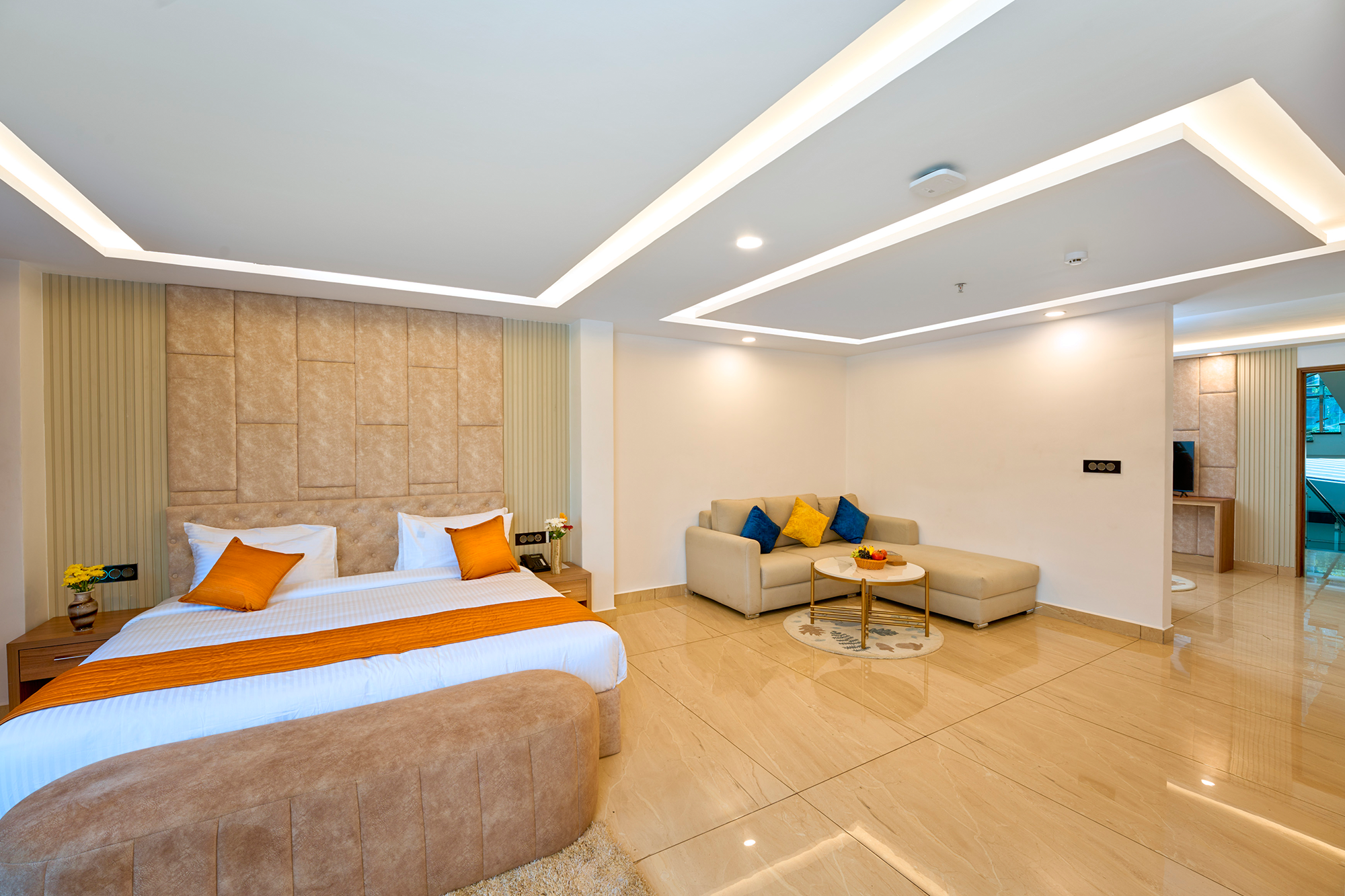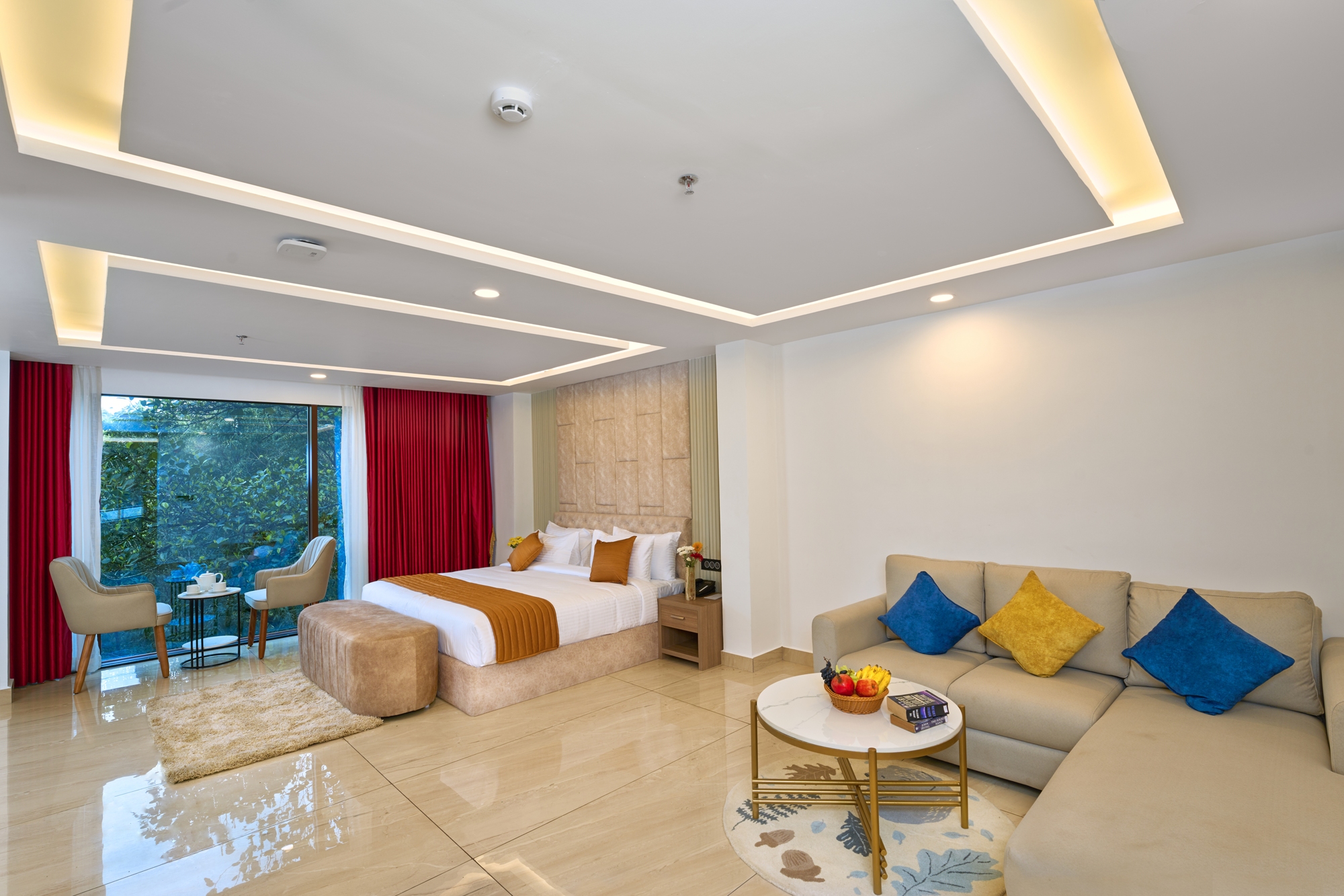 A stylish amalgam of form and function the suite is top-of-line in the range of accommodations on offer at Serene Horizon. Perfect for guests who expect nothing but the best. The suite comprising a living area and a sleeping area and a Jacuzzi at one end, is sumptuously furnished in shades of beige and brown and wood veneer paneling on the walls. Equipped with a plush king size bed and ample sofas offset by burgundy curtains over expansive ceiling to floor windows that look at splendid views of the surrounding vegetation, the suite is equipped with the state of the art in amenities.